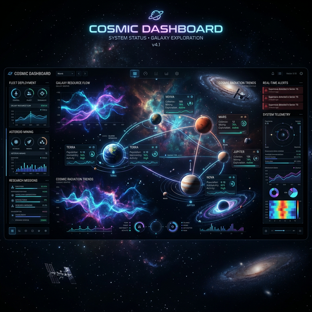 Interactive space exploration interface with real-time galaxy resource tracking and fleet management.