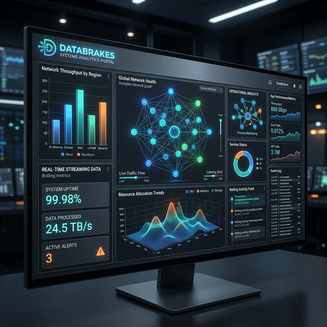 Sophisticated systems analytics portal featuring complex 3D data visualizations and real-time monitoring.